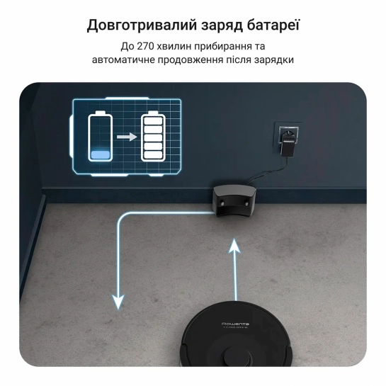 Длительный заряд батареи обеспечивает до 270 минут уборки, чтобы охватить до 270 квадратных метров пространства на одном заряде. А если робот разрядился не закончив уборку, он самостоятельно станет на зарядку и по завершении продолжит наведение чистоты.