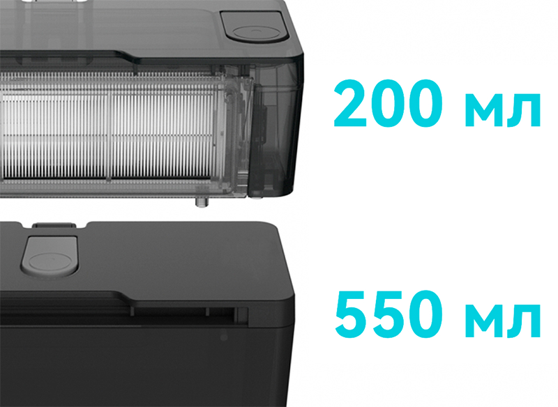 Вместо стандартного бака для воды Viomi V2 MAX оснащен двумя. Контейнер 2в1 для сбора пыли 300 мл совмещенный с водяным баком 200 мл позволяют одновременно проводить влажную и сухую оборку. Дополнительный резервуар на 550 мл предназначен для влажной уборки больших площадей.