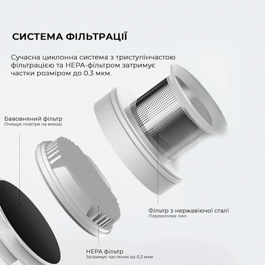 В Deerma Corded Stick Vacuum Cleaner Blue (DX1000) используется тройная система фильтрации, которая обеспечивает чистоту воздуха и поддерживает мощность всасывания. Технология циклона отделяет мусор от потока воздуха, а НЕРА-фильтр содержит мелкие пылинки и вредные микрочастицы.