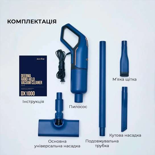 Приобретая Deerma Corded Stick Vacuum Cleaner Blue (DX1000), вы получаете не только пылесос, но и целый набор полезных аксессуаров для повседневной уборки. Вот что входит в комплект: