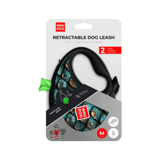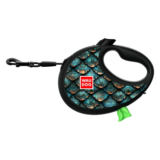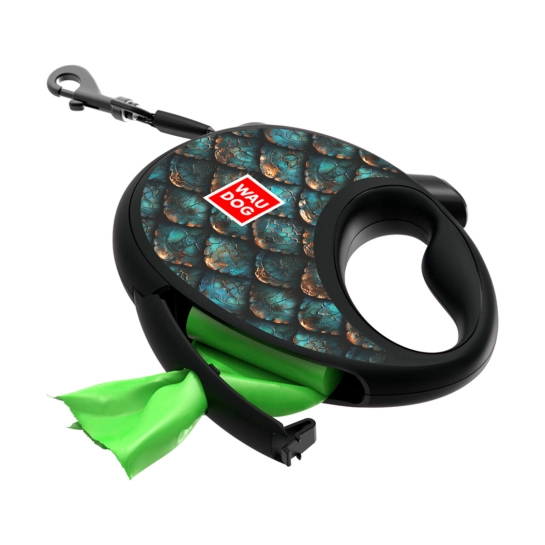 Рулетка-поводок для собак WAUDOG R-leash с контейнером для пакетов, рисунок Чешуя, светоотражающая лента, M, до 20 кг, 5 м (256-0179)