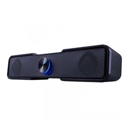 Модель оснащена подсвеченным регулятором громкости, удобно расположенным на передней панели. Он также выполняет функцию выключателя питания, что придает удобство в ежедневном использовании. Питание осуществляется через USB, поэтому не требуется подключение к сети — достаточно USB-порта на компьютере. Аудиосигнал передается через стандартный аудиоразъем, поскольку саундбар не имеет встроенной звуковой карты.