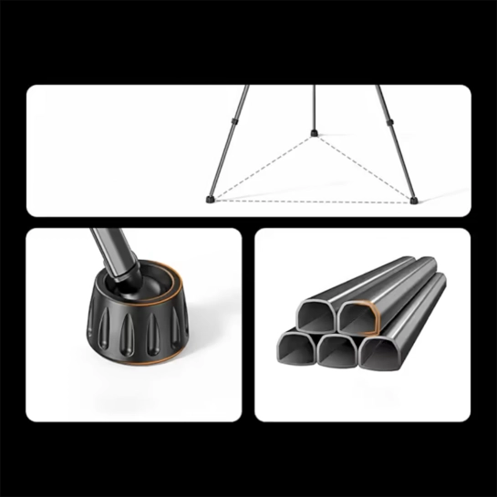 Дорожный штатив изготовлен из высококачественного алюминиевого сплава толщиной 0.8 мм, который не только прочный, но и легкий. Он подходит для использования в средах от -33 ℃ до 70 ℃ и не ржавеет даже при использовании в соленой среде.