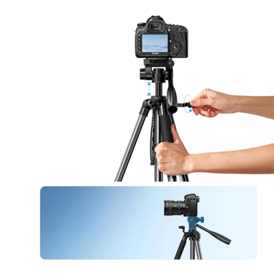 Штатив имеет 3 секции ножек, поэтому вы можете регулировать высоту штатива для различных сценариев. Высоту можно увеличить с 53.5 см до 175 см. Среднюю колонну можно отрегулировать на максимальную высоту 31.4 см.