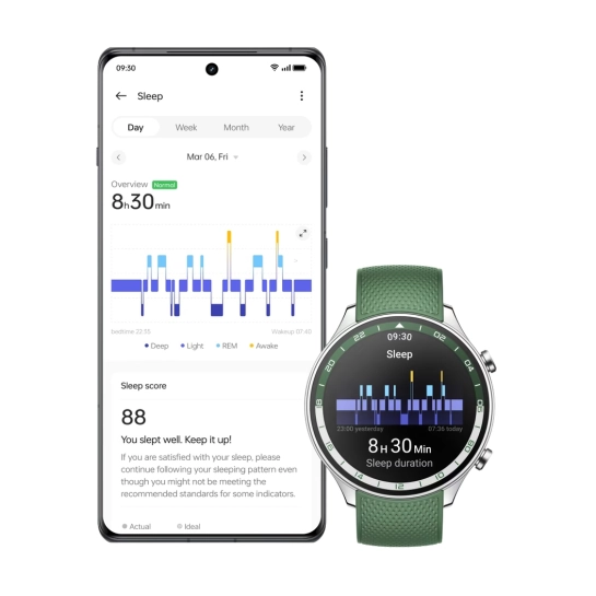 Часы Watch 2R помогают спокойно спать, оценивая качество вашего сна, дыхание, уровень кислорода в крови и данные о риске храпа, а также предоставляя результаты в виде простого ежедневного отчета, который поможет повысить качество сна.