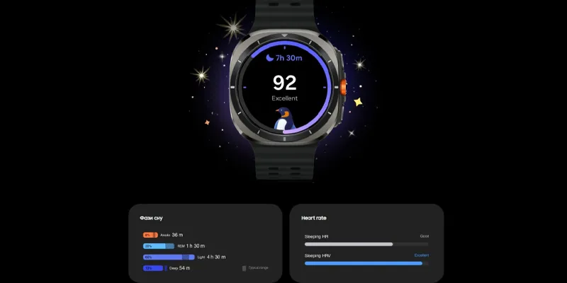Залогом высокой продуктивности всегда является качественный сон. С Galaxy Watch Ultra вы можете отслеживать фазы сна, его продолжительность, пульс во время сна, уровень насыщенности крови кислородом и даже храп. Получайте полезные советы по повышению качества вашего сна.