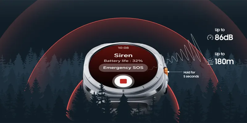 Если вы попали в беду, удерживайте кнопку быстрого доступа в течение 5 секунд, чтобы активировать мощный сигнал тревоги. Звук сигнала достигает 86 децибел и слышен на расстоянии до 180 метров, даже в окружении деревьев. Если сигнал GPS не доступен, ваш Galaxy Watch Ultra оснащен системой SOS, которая распознает падение и автоматически отправляет сигнал SOS при нажатии на главную кнопку, обеспечивая мгновенный доступ к медицинской информации.