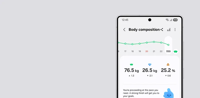Измеряйте показатели состава тела с помощью собственных пальцев: просто приложите средний и безымянный пальцы к кнопкам Galaxy Watch8, чтобы получить аналитику. Часы фиксируют ключевые показатели, включая вес, объем скелетных мышц и жировую массу. Устанавливайте персонализированные цели для каждого параметра и адаптируйте свой фитнес-план в соответствии с результатами. Отслеживайте изменения в своем теле со временем и постепенно приближайтесь к желаемой форме.