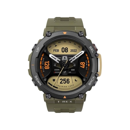 Amazfit T-Rex 2 обладает большим экраном, который облегчает просмотр, жизненно важных для вашего приключения, данных — будь то под солнцем пустыни, городскими фонарями или в походе при свете луны. Матовое покрытие часов и безель с металлическим напылением дополнены силиконовым, не впитывающим пот, ремешком, который сохраняет часы сухими и удобными, пока вы противостоите стихии.