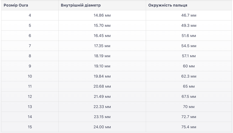 - Воспользуйтесь таблицей размеров смарт-колец Oura Ring для более точного подбора размера вашего идеального смарт-кольца: