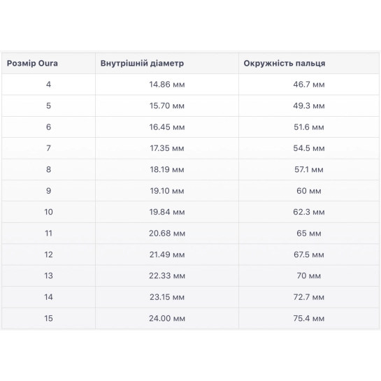 - Воспользуйтесь таблицей размеров смарт-колец Oura Ring для более точного подбора размера вашего идеального смарт-кольца: