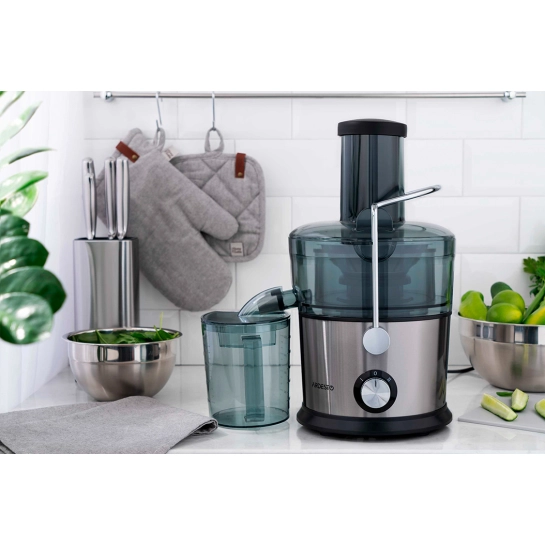 Принцип действия центробежной соковыжималки заключается в создании повышенного давления в отделении с фруктами и овощами, вследствие чего происходит отделение сока, а выжимки благодаря системе автоматического выбрасывания попадают в отдельную съемную емкость. Также в комплекте есть контейнер для сока объемом 1 л.