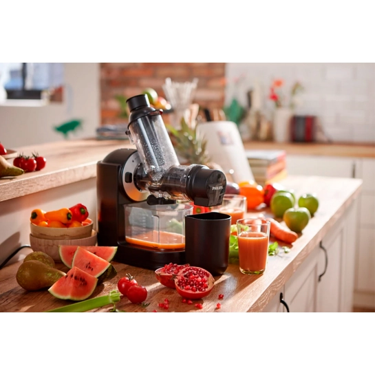 Уникальная конструкция новой шнековой соковыжималки позволяет легко собрать прибор и сразу начать его использовать. Соковыжималку удобно хранить и легко очищать — все съемные детали можно мыть в посудомоечной машине.
