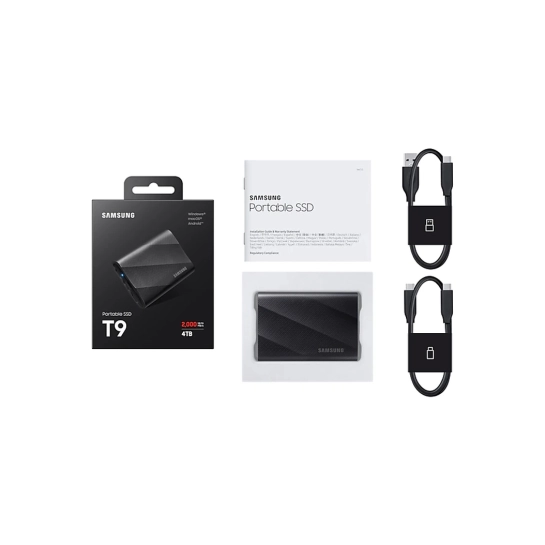 T9 совместим с Windows, macOS, телефонами и планшетами на базе Android, игровыми консолями, 12K-камерами и многим другим. В комплект поставки также входят кабели USB-C - C и USB-C - A для бесперебойного подключения.