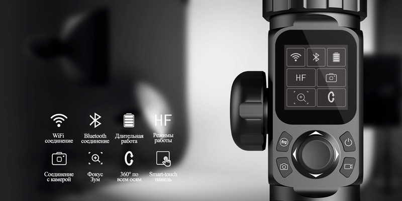 Сенсорная панель стедикама дает возможность для легкой регулировки фокуса / масштабирования / чувствительности / баланса белого / компенсации экспозиции / скорости двигателя / сцены и настроек режима работы стабилизатора.