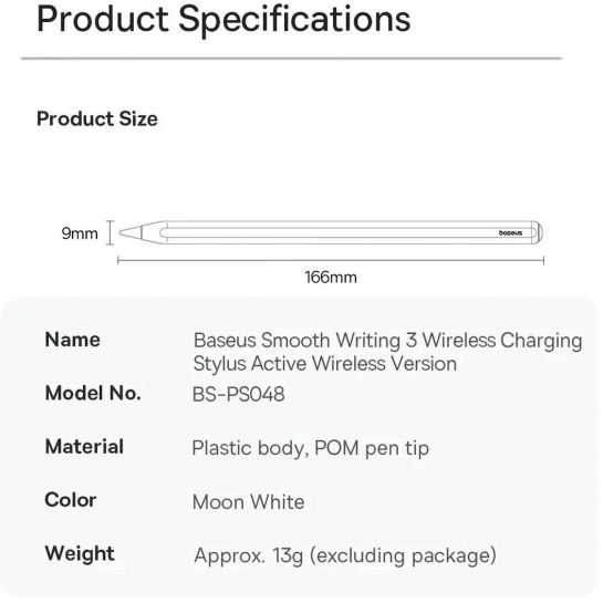 Корпус изготовлен из алюминиевого сплава с матовым покрытием, который не скользит и приятно лежит в руке. Весит стилус всего 15 г, а его размеры составляют 165.2 x 9.1 мм, что делает его удобным даже при длительном использовании. Минималистичное белое оформление добавляет стиля вашему устройству.