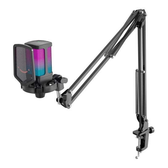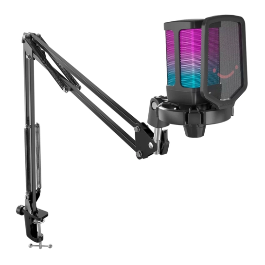 Прочный пантограф в комплекте позволяет регулировать горизонтальное и вертикальное положение микрофона, что обеспечивает идеальное расположение и эффективную организацию рабочего пространства. Регулируемая RGB-подсветка с разными режимами придает стилю и позволяет создать уникальную атмосферу, подчеркивая ваш профессионализм в любом творческом процессе. Микрофон совместим с Windows, Mac и PlayStation, а порт USB, расположенный за микрофоном, делает подключение простым и удобным.