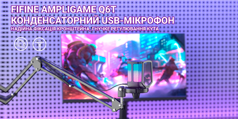 Микрофон Fifine Q6T – это отличный выбор для игр и контент-криейтинга, оснащенный всеми необходимыми аксессуарами для профессионального использования. Благодаря конденсаторному капсюлю Q6 обеспечивает качественный звук с глубокими низкими и чистыми высокими частотами, что делает его идеальным для интенсивных игровых сессий и видеоконференций. Встроенная функция шумоподавления эффективно уменьшает фоновый шум, обеспечивая чистую запись без необходимости в дополнительных программах.
