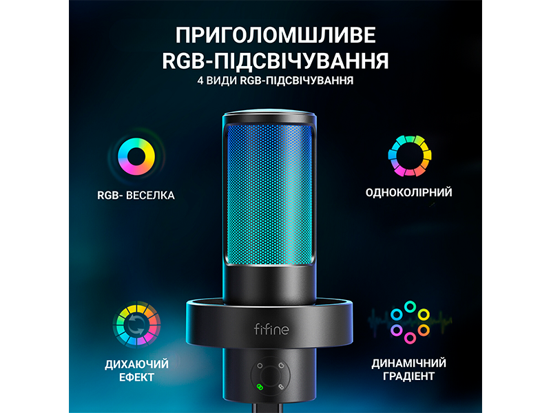 Микрофон FIFINE A8 PLUS имеет встроенную RGB подсветку, которая придает эстетический акцент и создает особую атмосферу при использовании. Вы можете выбрать один из четырех режимов подсветки: В режиме Статический цвет можно выбрать один постоянный цвет для подсветки микрофона, например красный, синий, зеленый и другие. В режиме Динамический градиент микрофон будет плавно изменять цвета, создавая эффект градиента. Динамический одноцветный режим заставит микрофон мигать одним цветом в соответствии с вашими пожеланиями. Режим дыхания микрофон будет имитировать дыхание, плавно изменяя интенсивность света. Эти режимы могут быть особенно полезны для потокового видео, видеоигр и студийных сеансов, где важно создать впечатляющую визуальную презентацию.