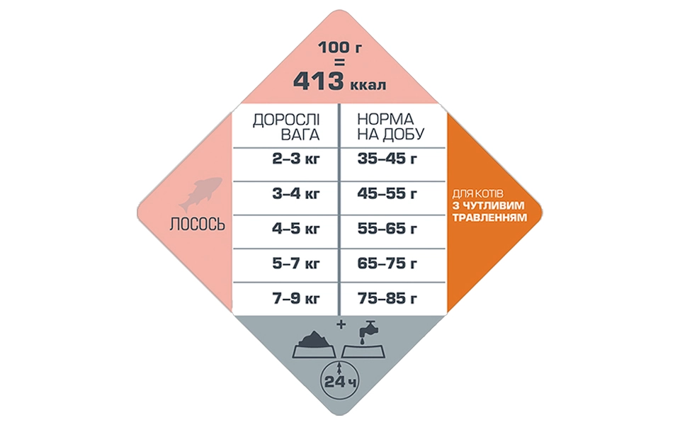- Высокое содержание животного белка: 80% белка животного происхождения (лосось).