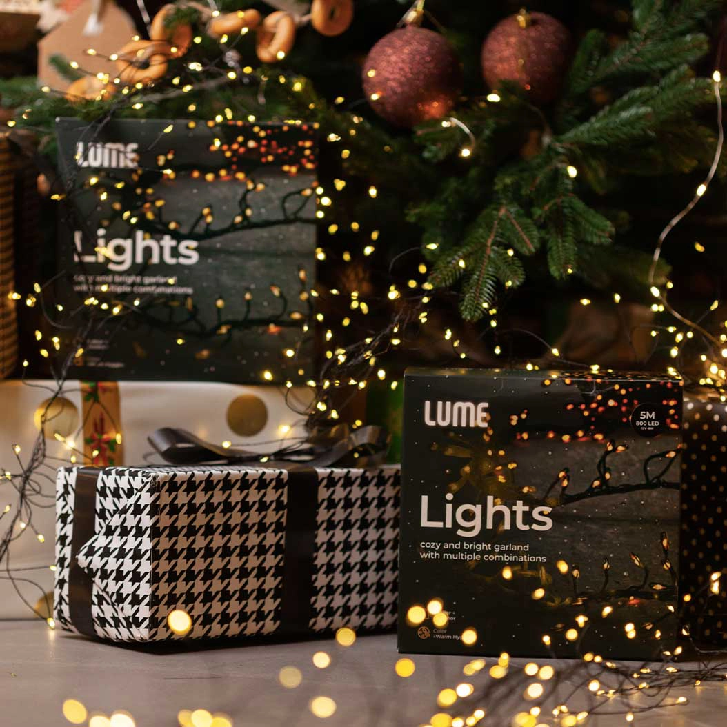 Lume Lights — это сотни огоньков очаровательного света «Warm Hygge», которые будут светится 8 разными способами: от мерцающего, как светлячки, Slow Flash, до убаюкивающего Wave Pattern. В отличии от обычных гирлянд, светодиодные лампы Lume Lights плотно размещаются по длине всей гирлянды, как иголочки на еловой ветке.