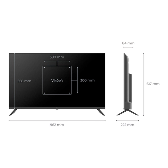 Телевизор выполнен в глубоком черном цвете с тонкими рамками, что подчеркивает его премиальный внешний вид. Он гармонично впишется в любой интерьер, а возможность настенного крепления по стандарту VESA позволяет создать аккуратную и стильную установку.