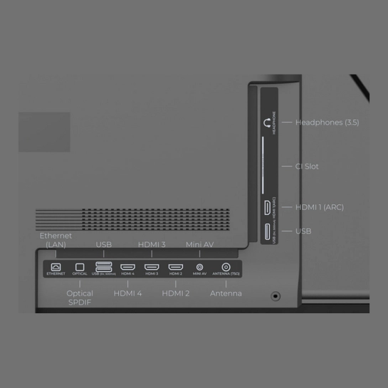 Телевизор оснащен разнообразными интерфейсами: **Headphone, 2 x USB, компонентный, S/PDIF, CI, 4 x HDMI**, которые обеспечивают удобство подключения самых разнообразных устройств. Для бесшовной интеграции в систему умного дома устройство оснащено цифровыми тюнерами **DVB-C, DVB-T, DVB-T2**.