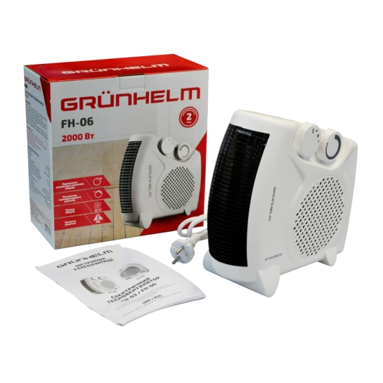 Тепловентилятор GRUNHELM FH-06, 1000/2000 Вт - электрический прибор, предназначенный для быстрого обогрева помещений всех типов - жилых, офисных, складских и т.д. площадью не более 20 м.кв. Имеет трех режимный принцип работы, что позволяет использовать его в любое время года, как летом, так и зимой.