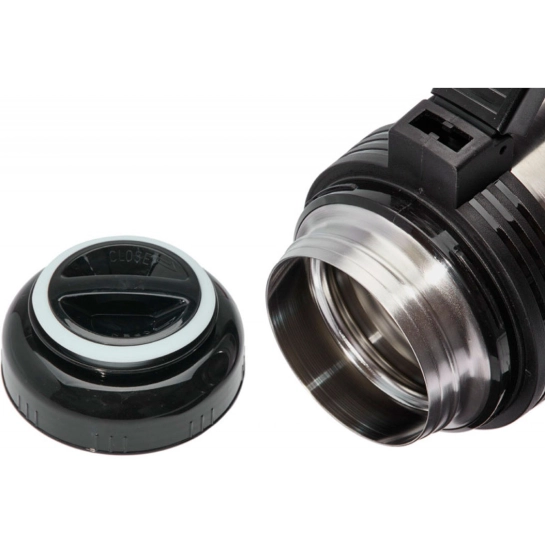 Внутренняя поверхность крышки выполнена из высококачественного пищевого полимера, и может быть использована в качестве чашки. Также термос комплектуется дополнительной полимерной чашкой и съемным ремнем, и оборудован удобной ручкой.
