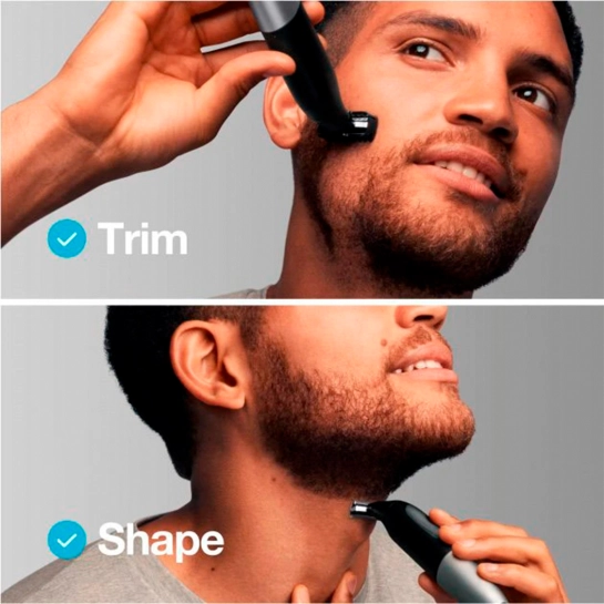 Универсальный набор для ухода All-in-One от Braun для мужчин. Комплект инструментов 7-в-1 позволяет без труда подстригать бороду, волосы на ушах и в носу, подстригать волосы и ухаживать за всем телом. Легко достигайте точности и эффективности с невероятно острым лезвием". SensitiveTrim. 14 настроек длины и технология AquaGrip для использования под водой обеспечивают полный контроль над уходом за собой.