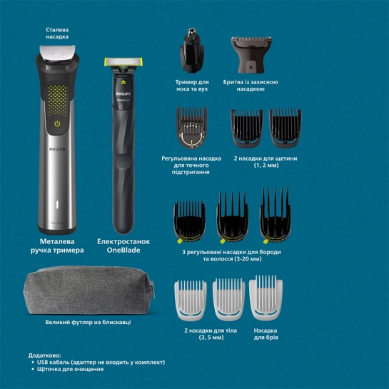 Этот универсальный набор стайлера предназначен для разнообразного ухода за волосами: надежный триммер обеспечит точное и мощное подравнивание волос на лице, голове и теле, а OneBlade благодаря уникальной технологии идеально подойдет для подравнивания и бритья волос любой длины на лице.