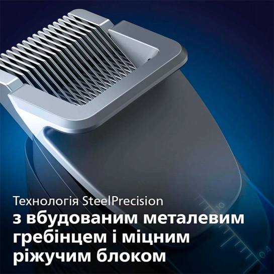 Триммер BT9000 Prestige располагает новой технологией SteelPrecision, которая включает в себя встроенный металлический гребень и мощный режущий блок. Эта система не гнется как пластиковый гребень и выдержит какое-либо усилие. Поэтому BT9000 Prestige всегда обеспечит максимально точное подравнивание.