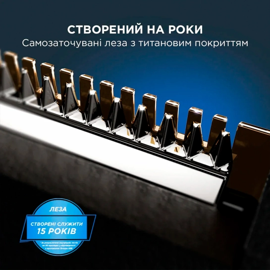 Лезвия Forever Sharp с титановым покрытием никогда не нуждаются в замене. Используйте 5 насадок для расчески (1-2-3-5-6 мм), чтобы обрезать короткие бороды или гладкое двустороннее лезвие для тщательного бритья.