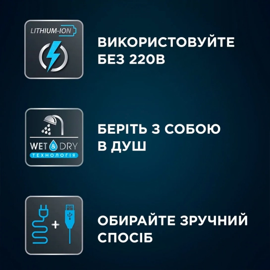 Литий-ионный аккумулятор обеспечивает автономность до 120 мин. Полная зарядка занимает всего 90 мин, а 4-минутная быстрая зарядка достаточна для полного сеанса бритья. Автономность, измеренная только на лезвии "Forever Sharp" На основе 5-МИНУТНОГО сеанса обрезки, 3 раза в неделю.