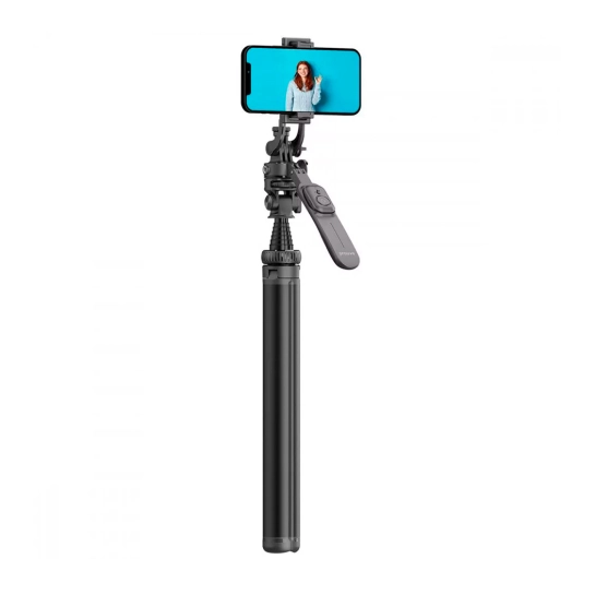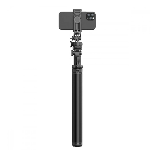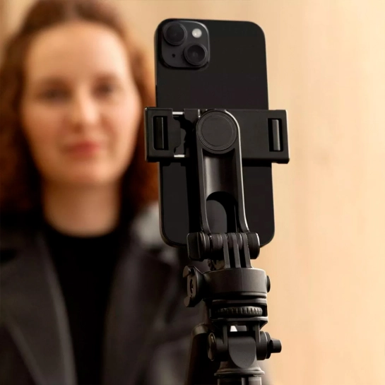 Трипод оснащен двумя видами крепления - для камеры и для телефона, что делает его универсальным для любого типа оборудования. Два дополнительных кронштейна позволяют крепить свет и микрофон, расширяя возможности съемки. Кроме того, конструкция вращается на 360 градусов, обеспечивая полный контроль над ракурсом.
