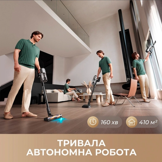 Dreame допоможе прибрати велике місце, і якщо для цього знадобиться більше години - не проблема. В економному режимі він може працювати безперервно до 160 хвилин, чого достатньо, щоб охопити площу близько 410 кв. м. Для ще більшої гнучкості передбачено два акумуляторні блоки – можна використовувати один або підключати обидва, коли це потрібно. Забирайте кілька кімнат або весь будинок одразу, не відволікаючись на підзарядку.