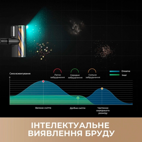Усередині Dreame встановлені інфрачервоні датчики, які буквально бачать частинки пилу, оцінюють їх кількість і розмір. Інформація передається в процесор і потужність всмоктування автоматично коригується. Вам залишається лише подивитися на PK-екран: він у реальному часі показує рівень забруднення, залишок заряду і режим роботи. Відчуйте контроль, тепер ви розумієте, як пилосос працює у конкретний момент.