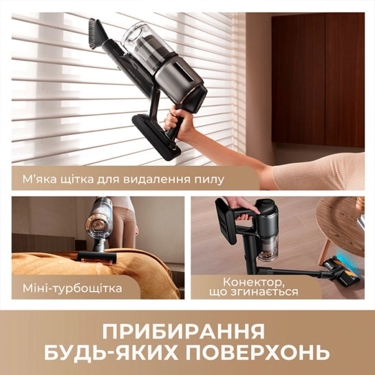Щоб прибирання було універсальним, Dreame має набір додаткових щіток. Моторизована міні-щітка з антизаплутувальною конструкцією легко справляється з волоссям і шерстю на поверхнях, а щітка для меблів підходить для більш делікатних зон - робочого столу, полиць або рам вікон і дверей. Пилосос стає по-справжньому універсальним інструментом, який замінює декілька пристроїв у будинку.