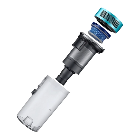 Пилосос випромінює чисте повітря завдяки багатошаровій системі фільтрації, яка затримує 99,999% пилу. Основний циклон і металевий решітчастий сітчастий фільтр вловлюють великі частинки пилу. Струменевий циклон і мікрофільтр уловлюють дрібний пил. Нарешті, фільтр тонкого очищення вловлює мікропил.