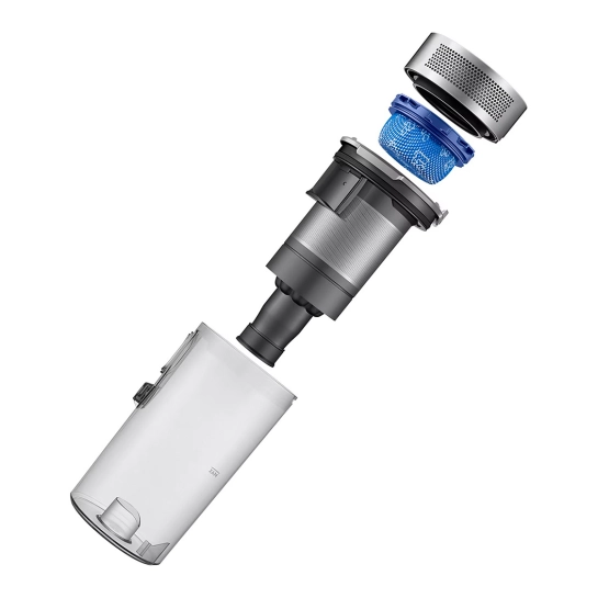 Контейнер для пилу легко очищається та підтримується в чистоті завдяки можливості миття як контейнера, так і системи фільтрації. Користувач може спорожняти контейнер, нахиливши його, не від'єднуючи від труби, що робить процес збирання зручнішим. Це спрощує догляд за пристроєм та збільшує його термін служби.