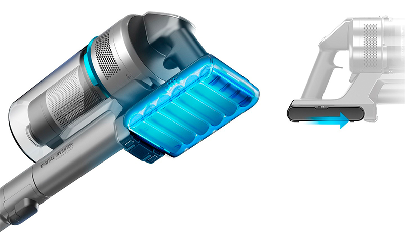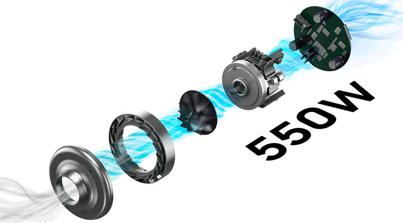 Силовий агрегат із потужністю до 550 Вт забезпечує ефективне прибирання на будь-яких поверхнях, включаючи як товсті килими, так і тверді підлоги. Використання технології Digital Inverter та системи Jet Cyclone оптимізує потік повітря, що дозволяє підтримувати стабільну потужність всмоктування. Двигун також має 10-річну гарантію, що свідчить про його надійність та довговічність.