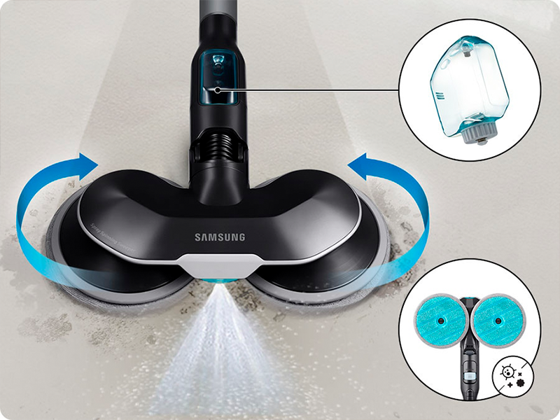 Очищайте тверді поверхні за допомогою Щітки для вологого прибирання, що активно обертається з розпилювачем. Дві подушечки стали більшими і важчими, обертаються зі швидкістю 260 об/хв протягом 100 хвилин.
