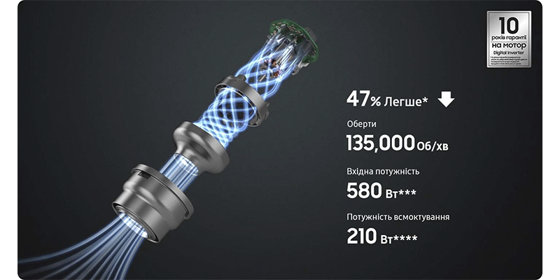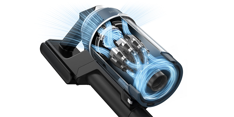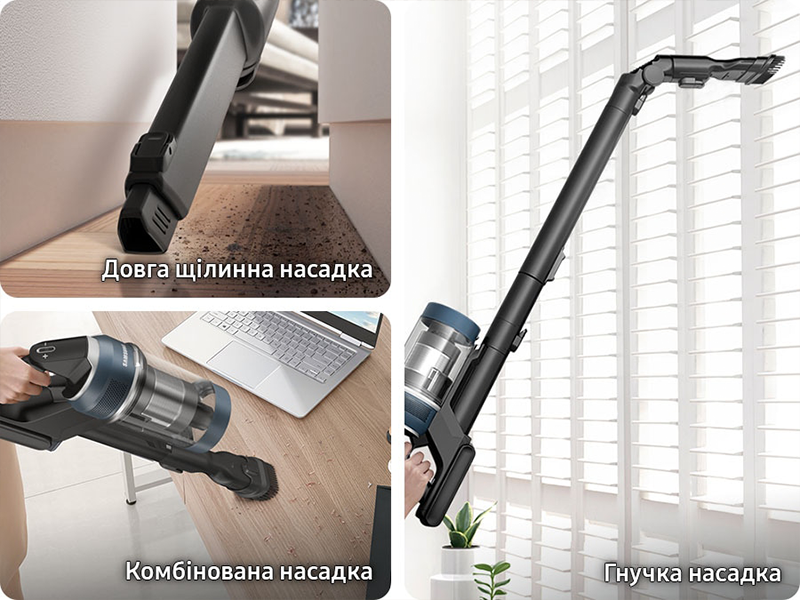 Легкий дизайн забезпечує максимальну зручність та зменшує навантаження на зап'ястя. Вага корпусу, що утримується в руці під час збирання, складає всього 1,44 кг, що на 24% менше, ніж маса традиційних пилососів Samsung. Ви легко можете прибрати весь будинок.