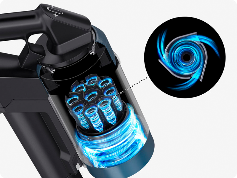 Насолоджуйтесь чистим повітрям та надзвичайно високою потужністю всмоктування завдяки високоефективній конструкції системи Jet Cyclone з багатьма циклонами. Оптимальний потік повітря зменшує опір, а 9 циклонів з 27 отворами системи мінімізують втрати потужності всмоктування.