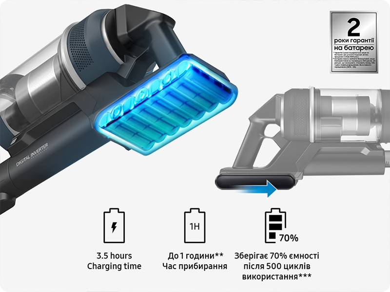Акумулятор високої ємності забезпечує до 60 хвилин. Ви можете замінити її запасний і прибирати протягом 120 хвилин. Після 500 циклів заряджання акумулятор зберігає до 70% початкової ємності, гарантійний термін акумулятора становить 2 роки.