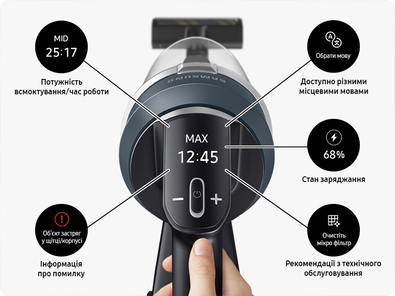 Легко керуйте та доглядайте пилосос завдяки інтуїтивно зрозумілому РК-дисплею, що підтримує кілька мов. З першого погляду спостерігається рівень всмоктування та залишок часу роботи акумулятора. Також пилосос попередить вас про проблеми та запропонує рішення.