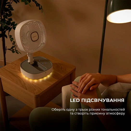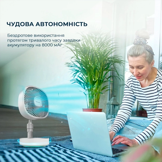 Акумулятор ємністю 8000 мАч забезпечує відмінну автономність, що дозволяє комфортно використовувати вентилятор без необхідності використання кабелів протягом тривалого часу.