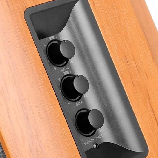 Корпус Edifier R1380T виконаний із високоякісного MDF-дерева з декоративним коричневим оздобленням. Таке рішення не тільки надає колонкам стильного, класичного вигляду, а й покращує акустичні характеристики: дерев'яна конструкція знижує внутрішні резонанси та посилює природність звучання. Результат — щільніший бас, чисті середні частоти та комфортні ясні високі, без спотворень навіть на високій гучності.