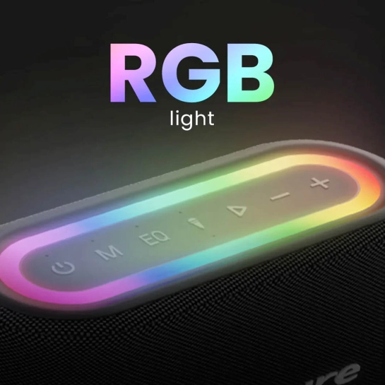 Корпус виконаний з удароміцного пластику з тканинною оббивкою, оснащений ручкою або ременем для перенесення. Вбудована RGB-підсвітка створює настрій вечірки і візуально підкреслює звук. Передбачена функція TWS — можна з'єднати два однакових пристрої для справжнього стереоефекту.