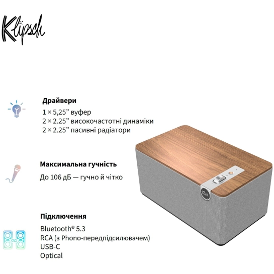 Акустика має компактний корпус з натуральним дерев'яним шпоном і тактильними перемикачами, що передають тепло преміумматеріалів, розміром всього 31 см завширшки, що легко вписується на полицю або стіл, але видає потужний 2.1-канальний звук з бі-ампліфікацією, де два 57-мм повнорозмірних. ходом створюють багатий, насичений бас, що вібрує в кімнаті, а професійне налаштування акустики Klipsch гарантує аудіофільський дозвіл без спотворень на високій гучності.